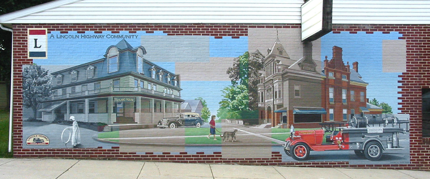 Abbottstown Mural This mural was completed for the Lincoln Highway Heritage Corridor and depicts a historical scene of Abbottstown, PA. The mural is interspersed with black and white and sepia tones. 2005, 12’ x 33’, acrylic paint, Abbottstown, PA.