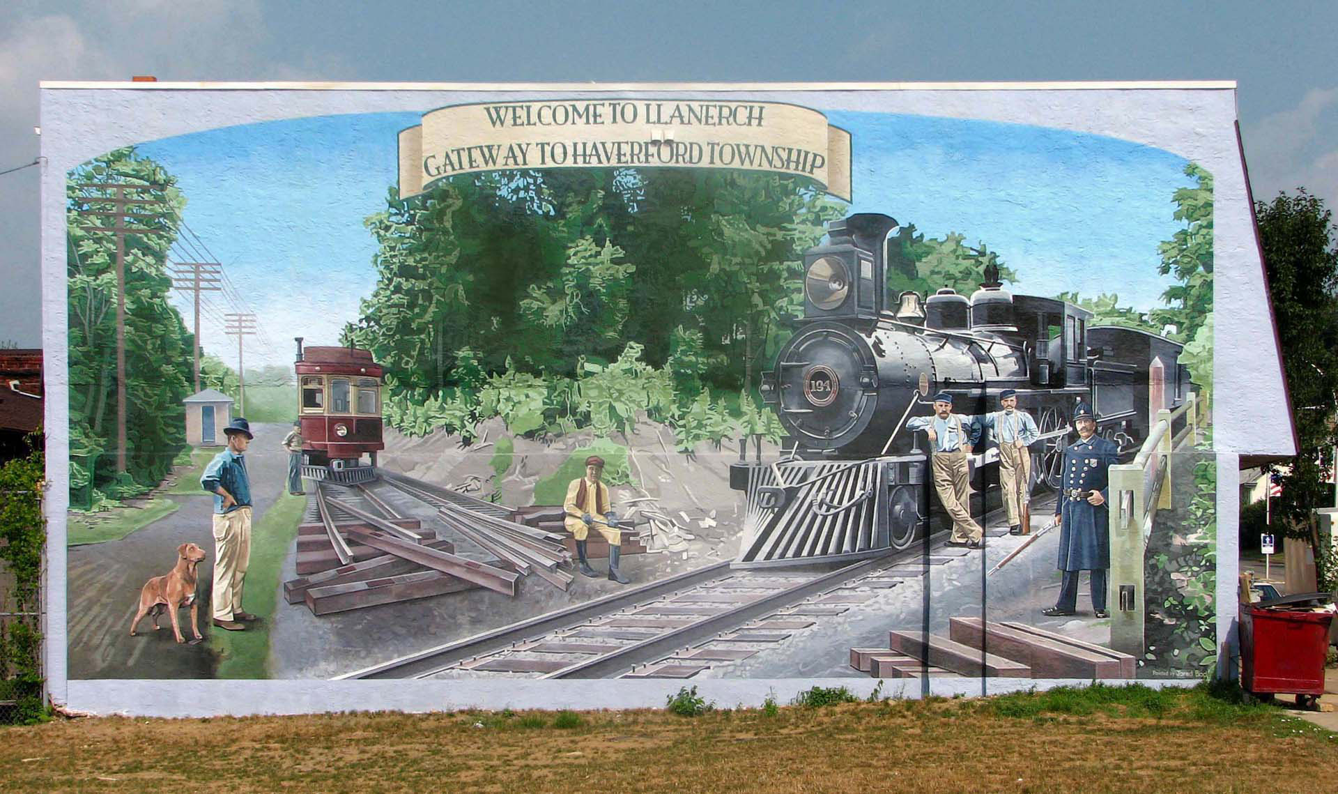 Battle of Llanerch Commissioned by Haverford Township, PA, this mural depicts an altercation that occurred between the Pennsylvania Railroad and the local trolley line at this site in the late 19th Century. 2006, 25′ x 50′, acrylic paint, Havertown, PA.