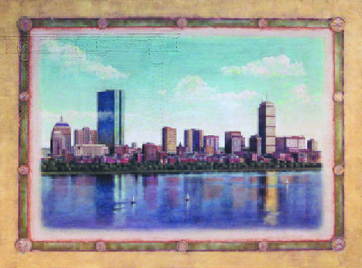 Acrylic paint, paper collage and pen and ink on watercolor paper.