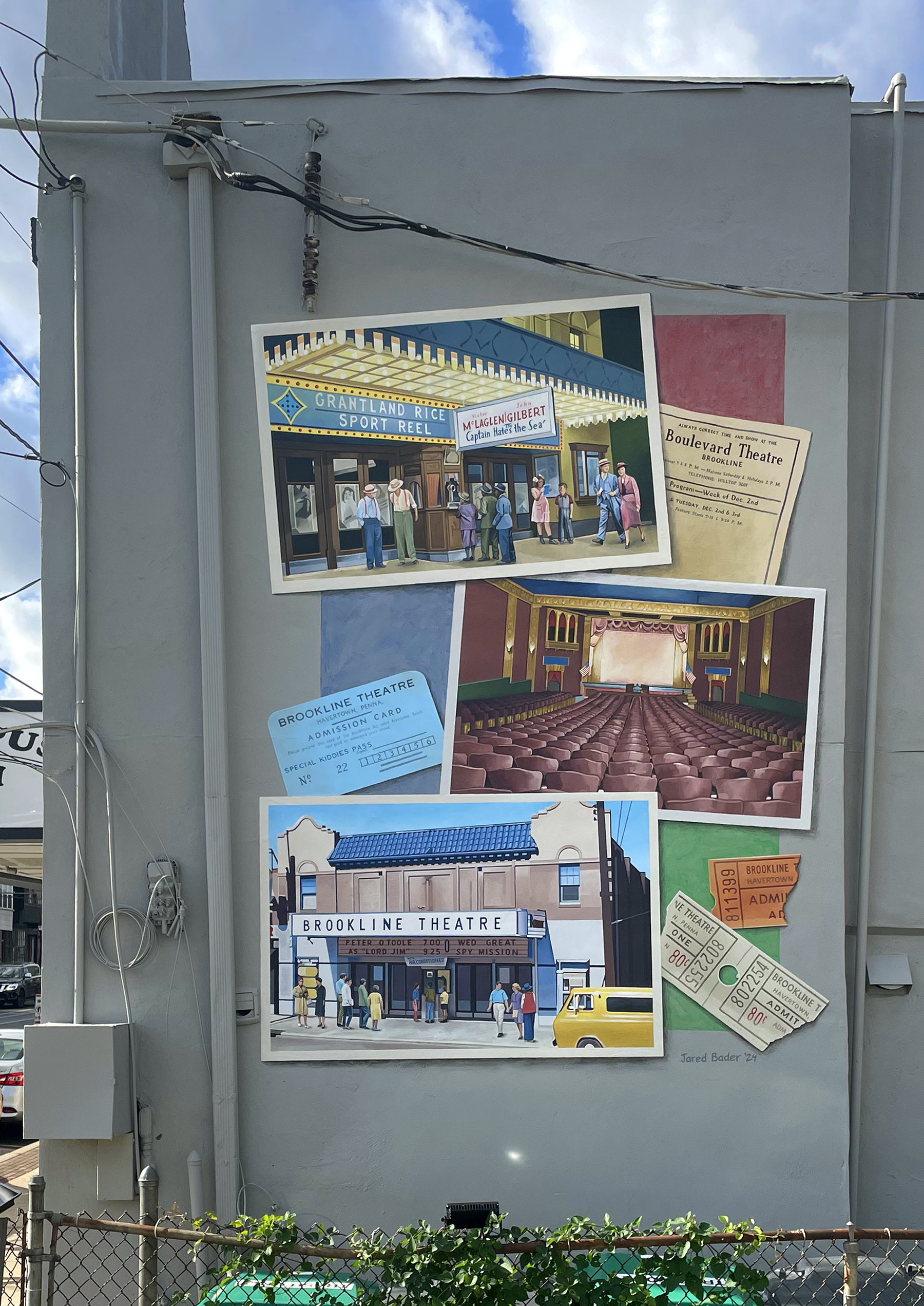 Brookline Theatre Nostalgia This mural highlights images of the old Brookline Movie theater. 2024, Acrylic on Pellon Cloth, Havertown, PA.