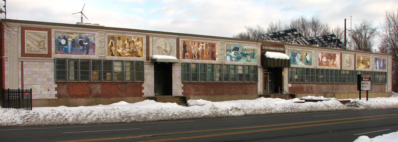 This mural was designed and painted in collaboration with A. Phillip Randolph High School students. The colored images represent the different trades that are taught in the school.