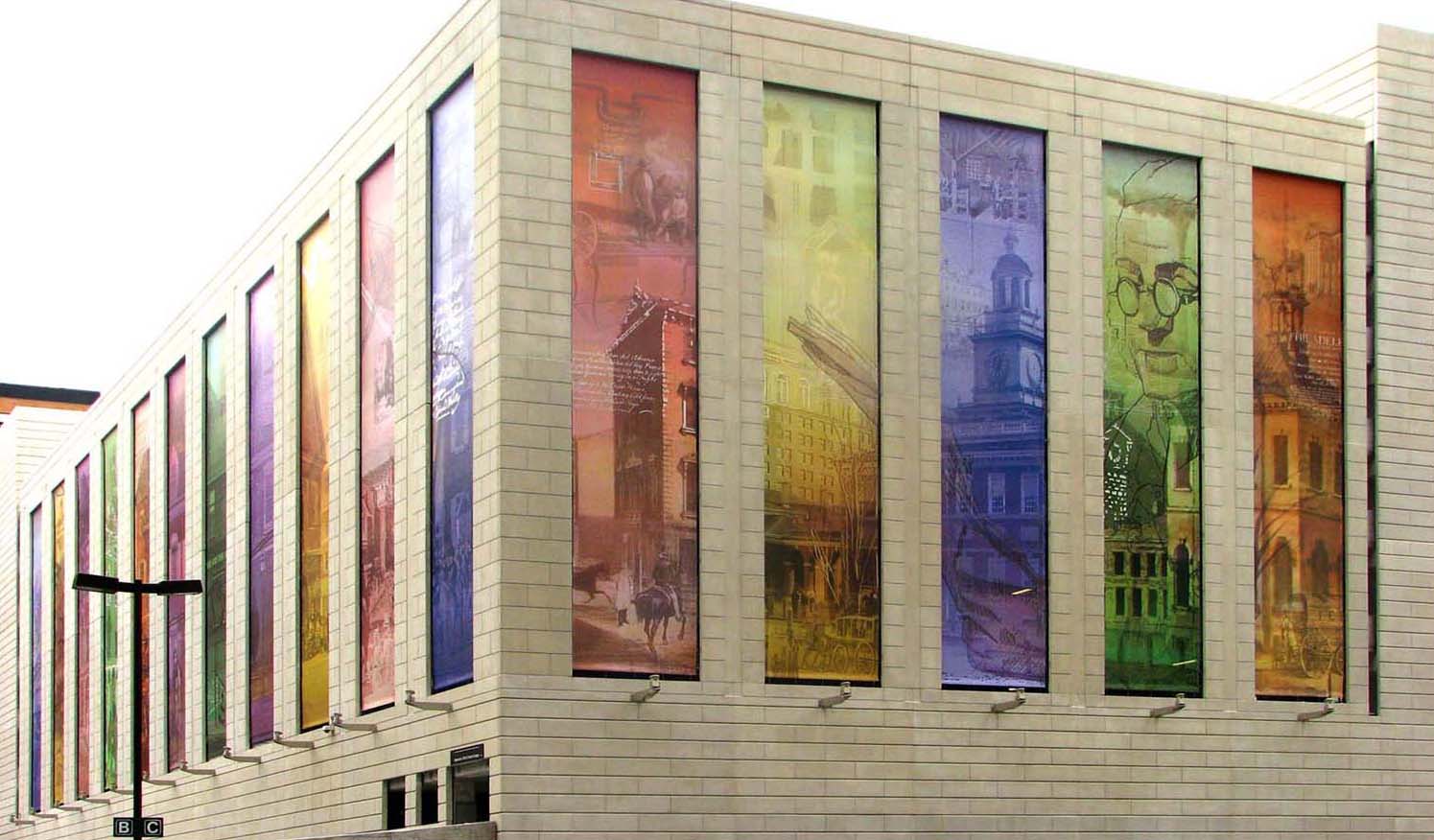 Variations on the Theme of City Narration Sponsored by the Interpark company, this mural was fully computer generated. The theme collaged historical and modern images from Philadelphia. 2006, 60’ x 80’, Computer generated printed vinyl banners, Philadelphia, PA.