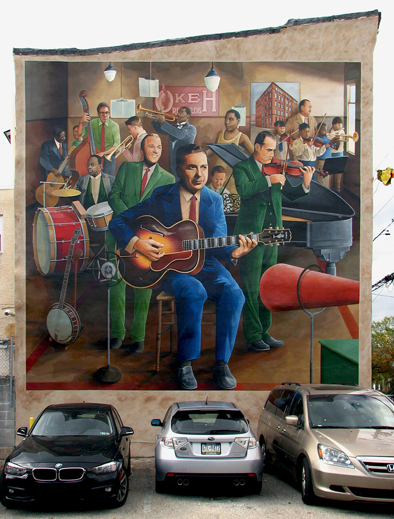 This mural explores the musical life of Eddie Lang, Father of Jazz Guitar. It also celebrates the Italian American heritage of Lang and the South Philadelphia neighborhood where the mural is located by copying the color palette and lighting of Italian painter Michelangelo Merisi da Caravaggio.
