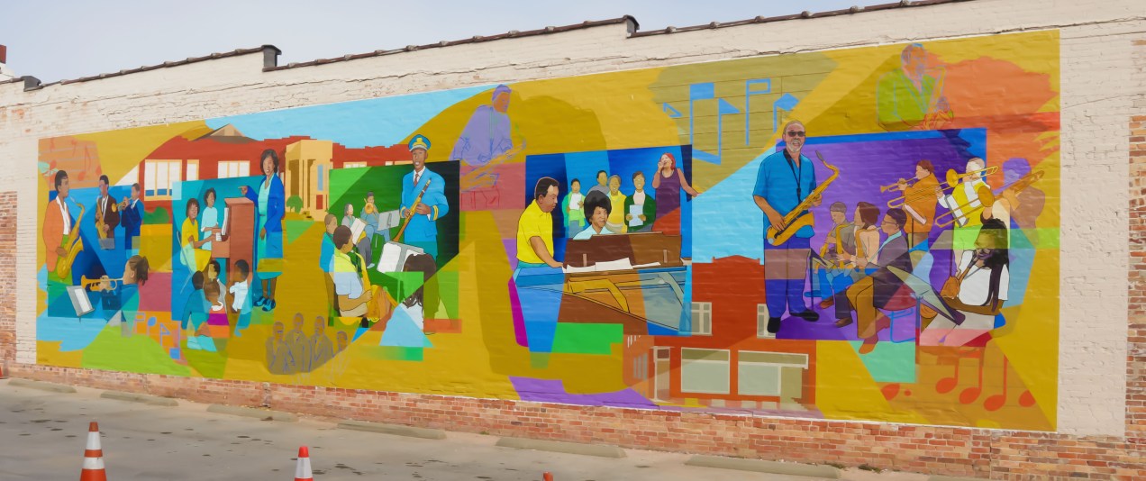 Tribute To Kinston Music Educators This mural celebrates the contributions African American music educators made towards the development of Kinston, NC as a music center for a variety of musical styles. 2020, acrylic paint on polyester cloth, 15′ x 60′, Kinston, NC.