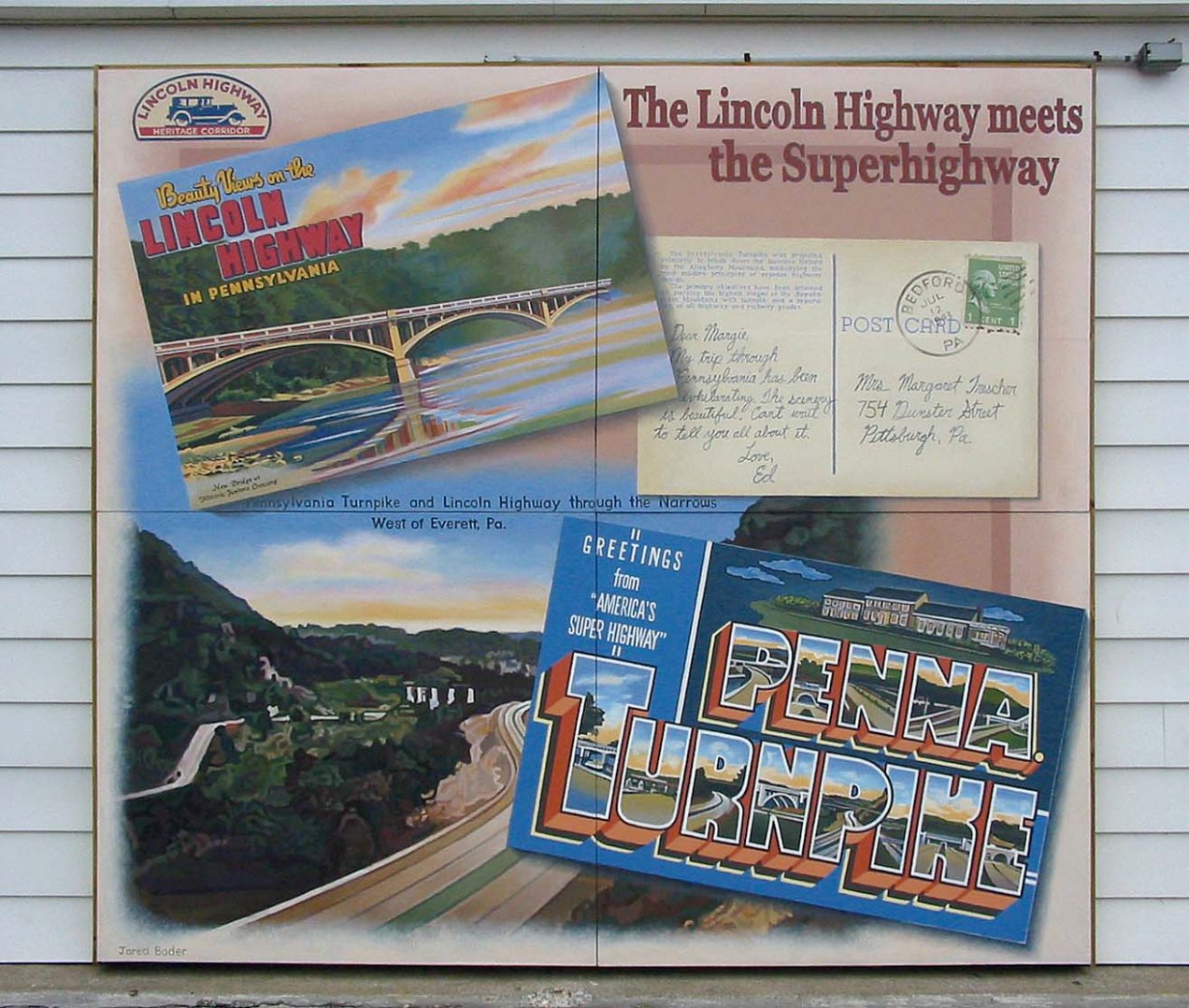 This mural was commissioned by the Lincoln highway Heritage Corridor Association. It depicts 1950\’s style postcards highlighting the intersection of the old Lincoln Highway and the Pennsylvania Turnpike.