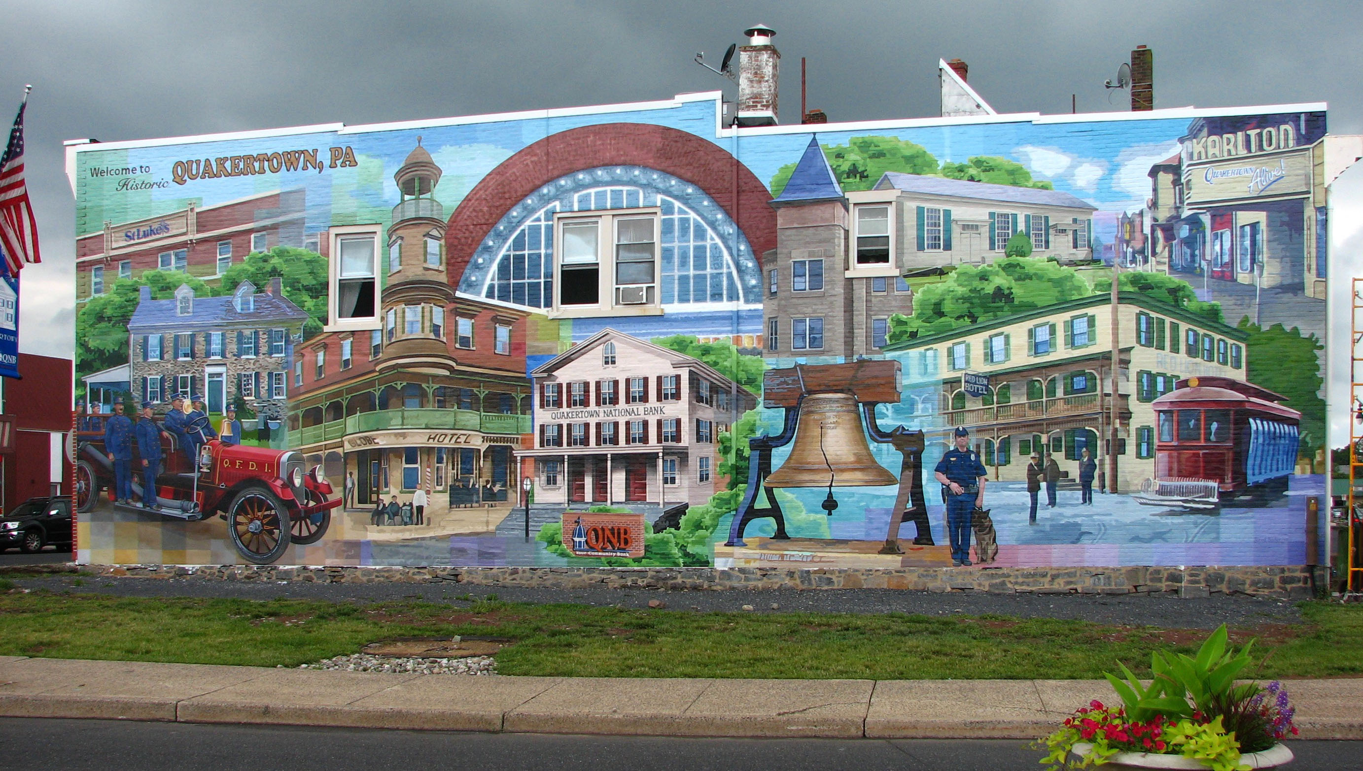 Quakertown mural This mural was created for the city of Quakertown, PA highlighting architecture and events form Quakertown history. 2017, 25′ x 82′, acrylic paint on Pellon cloth, Quakertown, PA