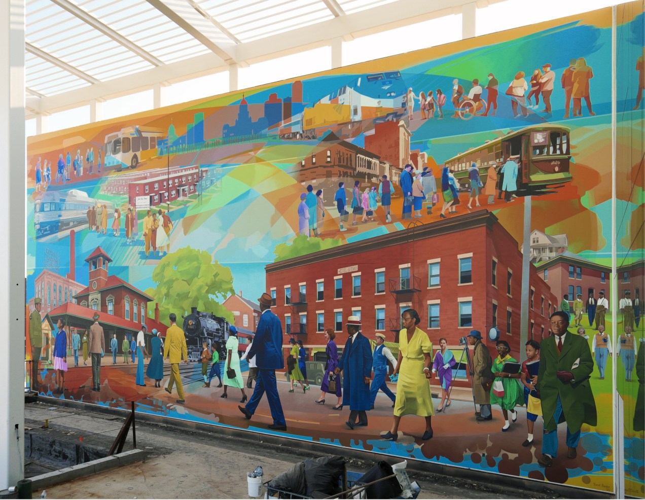 Corridor Through History and Development This mural explores the relationship between the historic black communities surrounding the mural site at the new transportation hub and the historical use of public transportation. 2023, Acrylic and Pellon cloth, 31’ x 62’, Springfield, IL.