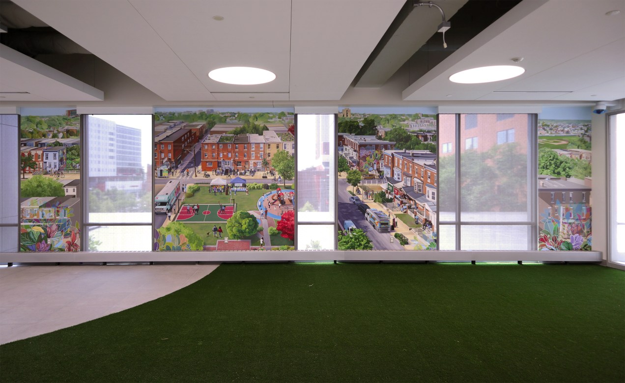 This Mural is a backdrop for a simulated park setting for students to practice medical care. The cityscape highlights healthy living and community connections.