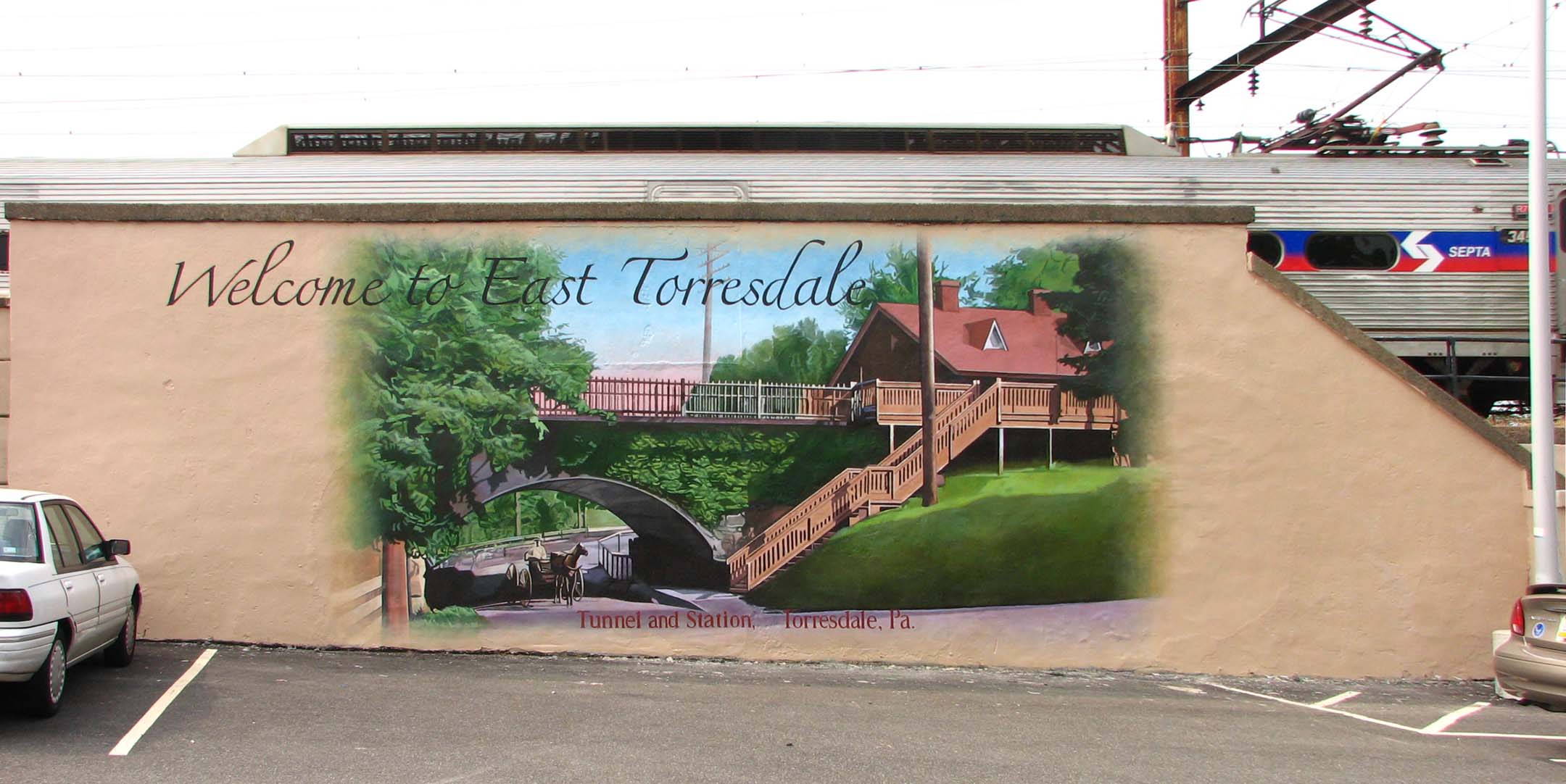 Welcome to East Torresdale This mural depicts a railroad station that existed on this site in the early 20th Century. The image was taken from an old postcard. It was commissioned by the City of Philadelphia. 2010, acrylic paint, 12′ x 35′, Philadelphia, PA